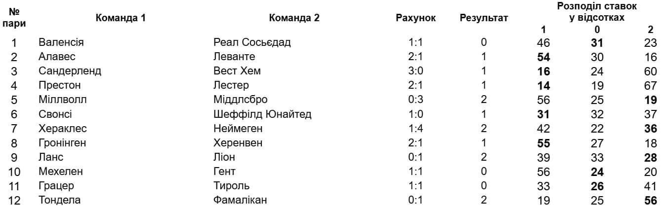 З іншого боку, маємо три результати з показником "угадуваності" в межах 50-60 відсотків, але прогнозистам це особливо не допомогло. У підсумку вчетверте поспіль ніхто не вгадав 12, 11 і 10 результатів.