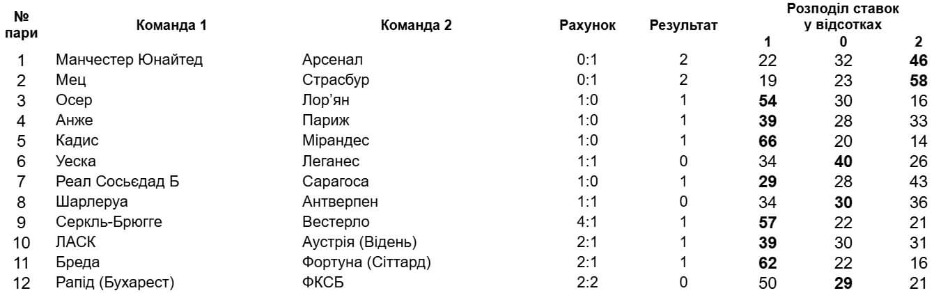 Відразу 5 матчів мають показник "угадуваності" понад 50%, відтак джекпот мав усі шанси нарешті знайти свого героя. Але шестеро учасників припустилися єдиної помилки, тому мрії про головний виграш доведеться відкласти до кращих часів. Залишається додати, що виграш за "11" становить 1806 грн.