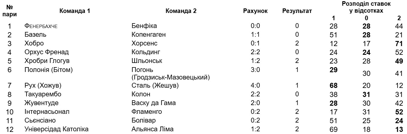 Якщо в попередньому тиражі було дві сенсації, то тепер - тільки одна. Вона трапилася в Копа Судамерикана, де "Універсідад Католіка" в рідних стінах поступився "Альянса Ліма". Перуанці обіграли еквадорців вдруге протягом тижня, на що було зроблено менше 13% ставок.