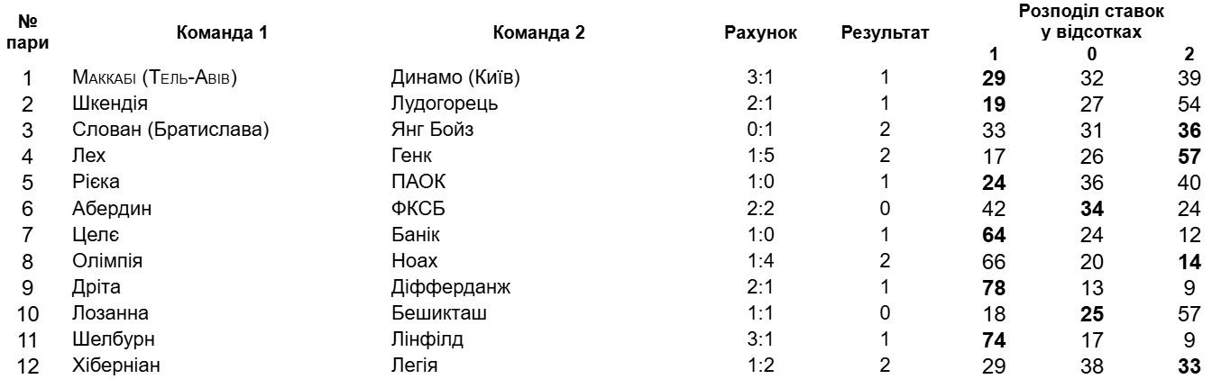А головна сенсація трапилася в Любляні, де місцева "Олімпія" була розгромлена вірменським "Ноахом" (14%). Крім цього, македонська "Шкендія" завдала поразки болгарському "Лудогорцю" (19%). Також у тиражі було чимало матчів на три результати.
