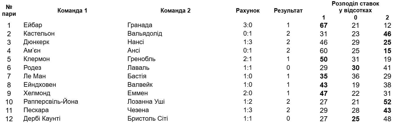 Єдина сенсація трапилася у французькій Лізі 2, де "Ам'єн" зазнав домашньої поразки від "Ансі" (15% ставок). Тим часом найбільш прогнозованою стала домашня перемога "Ейбара" над "Гранадою" в іспанській Сегунді (67%). Крім цього, маємо 4 результати з показником "угадуваності" в районі 50%.