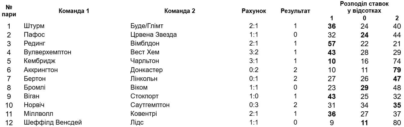 Тим часом Кубок англійської ліги подарував дві гучні сенсації. Найбільше здивував "Кембридж", який заробив менше 10% ставок за перемогу над "Чарльтоном". У свою чергу "Шеффілд Венсдей" по пенальті переміг "Лідс", тоді як на нічию було зроблено 11% прогнозів. Цікаво, що в серії пенальті гості не реалізували жодного удару...