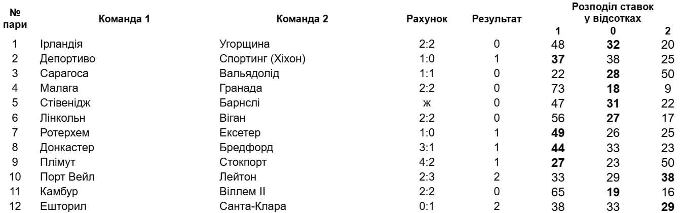 Головна несподіванка трапилася в іспанській Сегунді, де "Малага" не змогла перемогти "Гранаду" (18% ставок). А в Нідерландах поділили очки "Камбур" і "Віллем ІІ" (19%).
