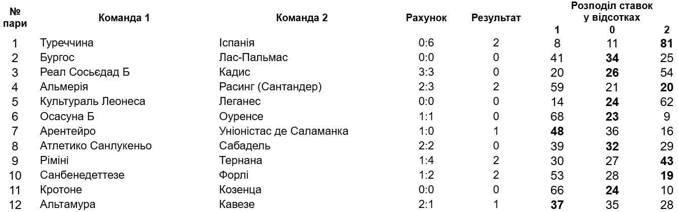 Найбільша несподіванка відбулася в італійській Серії C, де гостьову перемогу здобув новачок дивізіону "Форлі" (19% ставок). Також звертаємо увагу на домашню поразку "Альмерії" від "Расинга" (20%).