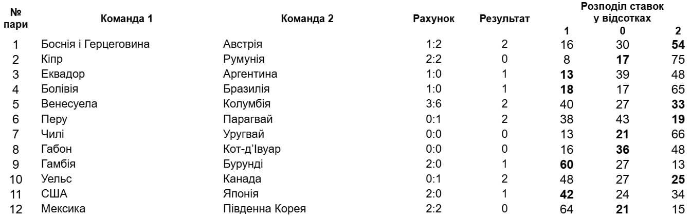Збірна Парагваю завершила відбір гостьовою перемогою над перуанцями (19%), а команда Чилі вистояла в поєдинку проти Уругваю (21%). До числа несподіванок також належать дві нічиї: між Мексикою та Південною Кореєю (21%), а також між Кіпром та Румунією (17%). Цікаво, що після матчу в Нікосії попросив про відставку 80-річний наставник румунів Мірча Луческу, але реакції на його прохання наразі немає.