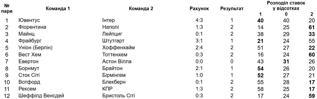 Загалом у тиражі було 5 пар із показником "угадуваності" понад 50%. Втім, це не особливо допомогло прогнозистам, адже тільки один із них вгадав 10 результатів. Його виграш становить 7405 грн.