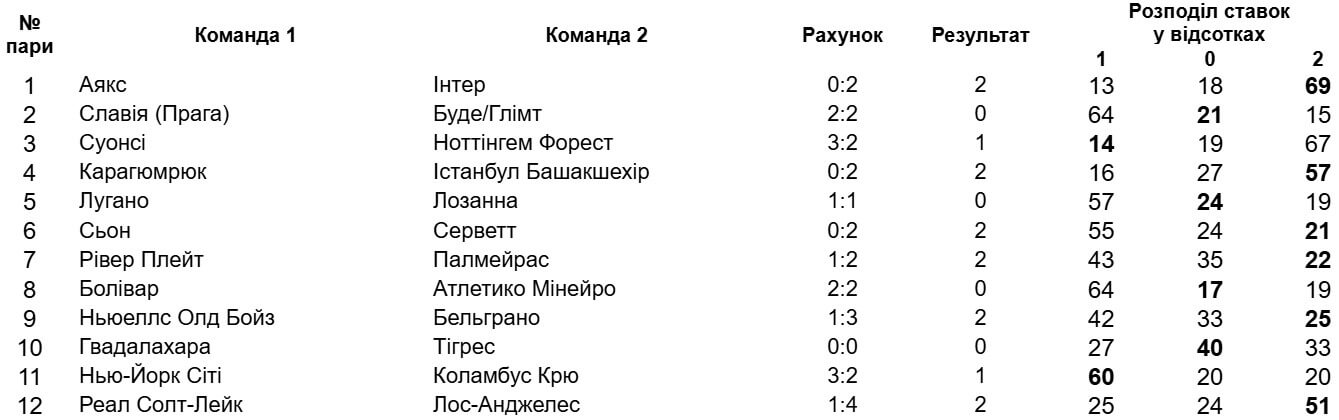 Додали складності швейцарські та заокеанські результати. Особливо - нічия в Копа Судамерикана між "Боліваром" і "Атлетико Мінейро" (17%). А в Кубку Лібертадорес "Рівер Плейт" поступився "Палмейрасу" на своєму полі (22%).