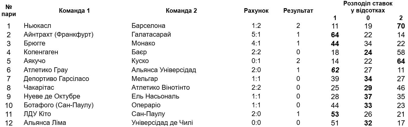 У тиражі взагалі не було несподіваних результатів, а найбільше здивувала нічия між "Копенгагеном" і "Баєром" у Лізі чемпіонів (24% ставок). Протягом матчу леверкузенці двічі зрівнювали рахунок, причому вдруге вони відігралися на 91 хвилині завдяки автоголу у виконанні суперника.