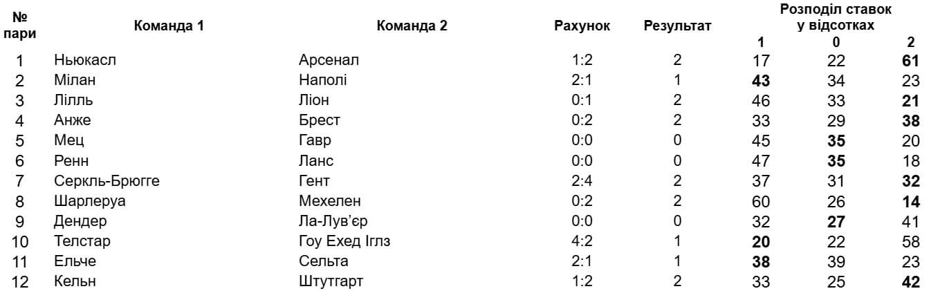 Найпрогнозованішою у недільному тиражі стала гостьова перемога "Арсеналу" над "Ньюкаслом" (61% ставок). Втім, "гармаші" вирвали перемогу ціною надзусиль, забивши вирішальний гол на 96 хвилині. Більш того, вони були близькими до поразки в цьому матчі, адже зрівняли рахунок тільки на 84 хвилині. Авторами голів стали Меріно і Габріел, тоді як у складі господарів відзначився дороговартісний новачок Вольтемаде.