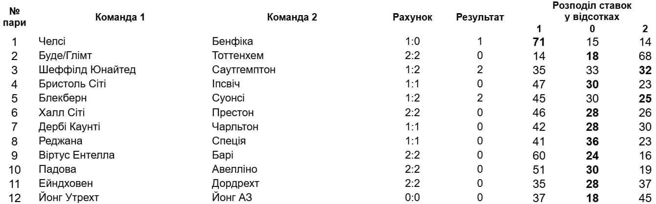 Також у несподівану нічию зіграли молодіжні команди "Утрехта" та АЗ, однак у цьому випадку забитих голів не було взагалі (18%). Зрозуміло, що замахнутися на джекпот у такому тиражі було складно. Двоє учасників спробували це зробити, але вони обмежилися вгаданими "десятками" (по 2853 грн).