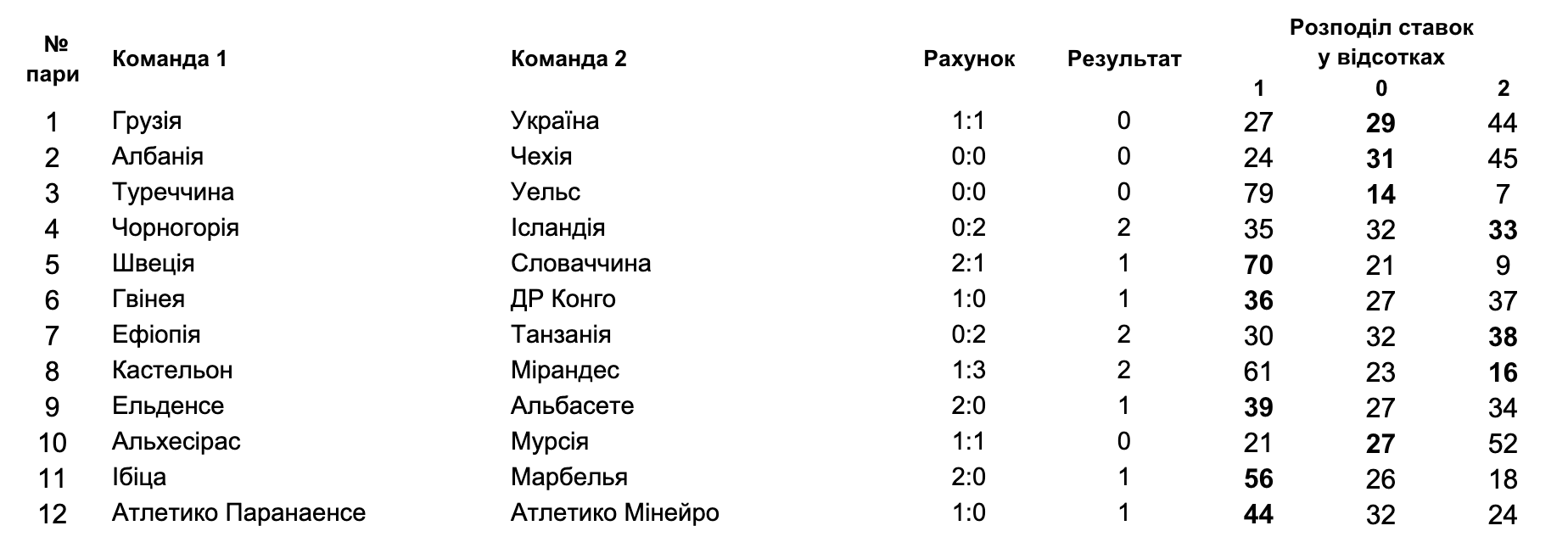 Збірна Швеції здобула пряму путівку до дивізіону B завдяки домашній перемозі над словаками (70%). А ще одна несподіванка трапилася в матчі іспанської Сегунди між "Кастельоном" і "Мірандесом", у якому сильнішими виявилися гості (16%).