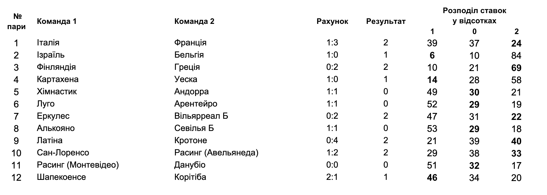 Програма стала значно складнішою завдяки домашній перемозі "Картахени" над "Уескою" (14%). Зрештою у виграші залишився лише один учасник, що правильно спрогнозував 10 результатів. Його виграш становить 5362 грн.