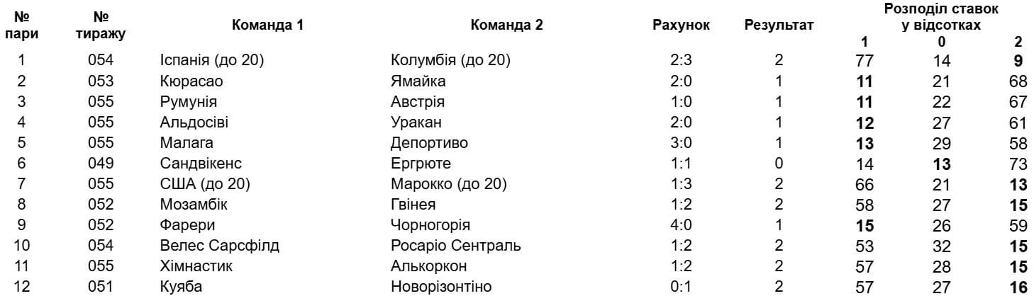 Найгучніша сенсація тижня відбулася на молодіжному чемпіонаті світу U-20, де настав час чвертьфіналів. В одному з них іспанці програли колумбійцям, на що було зроблено трохи більше 9% ставок. Нагадаємо, саме Іспанія в 1/8 фіналу відправила додому збірну України. Крім цього, у 054 тиражі "Велес Сарсфілд" поступився "Росаріо Сентраль" у черговому турі чемпіонату Аргентини (15%).