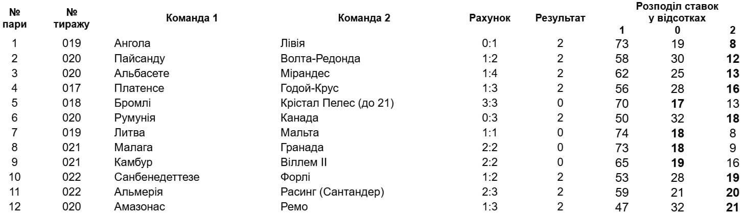 Автором найгучнішої сенсації 017 тиражу став "Годой-Крус", який завдав гостьової поразки "Платенсе" в чемпіонаті Аргентини (16% ставок). А в 021 тиражі головна несподіванка трапилася в іспанській Сегунді, де "Малага" не змогла перемогти "Гранаду" (18% ставок). Тим часом у Нідерландах поділили очки "Камбур" і "Віллем ІІ" (19%).